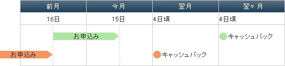 | ・ | 毎月15日の23時から翌16日の2時までの間は、キャッシュバック締め切り処理のため受付停止させていただきます。何卒ご了承ください。 |